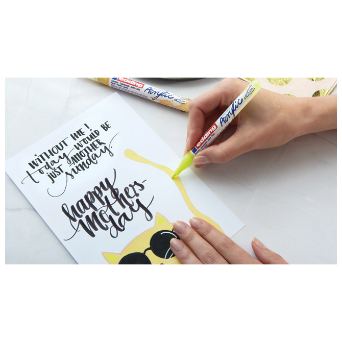 trajno, pigmentirano okrogel vrh širina tiska: 1-2 mm odporen je na: vodo, brisanje in svetlobo primerno za: platno, papir, karton in les šibak vonj se hitro suši (zato je primerna za levičarje)