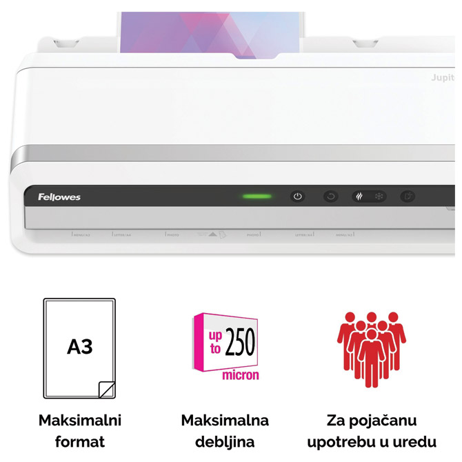plastificira dokumente do formata A3 (največja širina 320 mm) vsebuje: 6 valjev folija: do 250 mikronov (debelina folije se samodejno prilagodi - AutoSense) največja hitrost 140 cm/minuto čas ogrevanja 1 minuta tudi fotografije laminatov 5 temperaturnih nastavitev za vročo in hladno plastifikacijo ročaj za lažje prenašanje Tehnologija toplotne zaščite HeatGuardTM (dvojna izolacija ohišja za ohranjanje toplote v notranjosti laminatorja, medtem ko zunanja površina laminatorja med uporabo ostane hladna) majhen svetlobni vodnik za produktivno laminiranje brez zatikanja Polica drži folije med prehodom. Svetlobni in zvočni signal označuje pripravljenost za delovanje tehnologija sproščanja za sprostitev zagozdenega nastavka s pritiskom na gumb samodejni izklop plastifikatorja po 30 minutah neaktivnosti za varčevanje z energijo senzor čiščenja 2 leti garancije