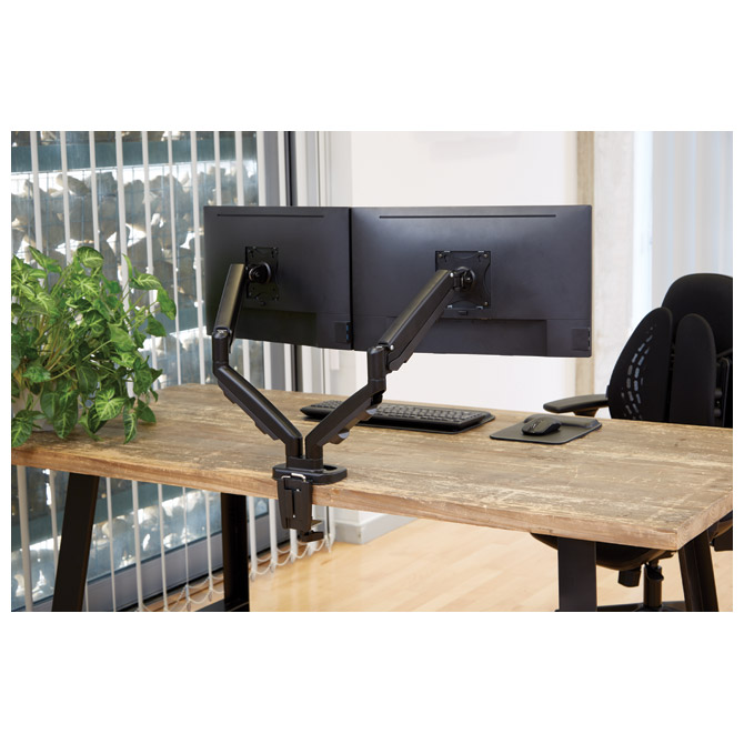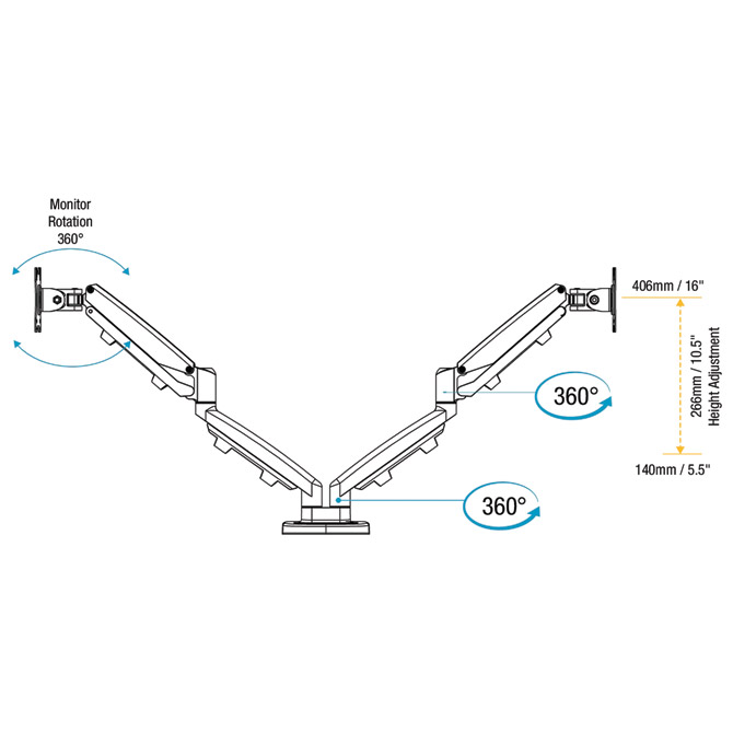 dve kovinski roki z nastavljivo višino vsak nosilec drži en monitor do 8 kg in do 40" razpon višine: 14-40,6 cm največja velikost zaslona: 39" (99,06 cm) največji doseg: 53,8 cm vrtenje držala: 360° nagib zaslona: +/- 90° VESA: 75x75/100x100 raven gibanja: vir plina vgrajeno upravljanje kablov hitra montaža nastavitev plinske vzmeti z dotikom prsta pomaga zmanjšati obremenitev oči, vratu in hrbta ter omogoča udobno delo neodvisno testiran za izpolnjevanje ergonomskih zahtev, določenih v evropski zdravstveni in varnostni zakonodaji: EN ISO 9241-5 dimenzije: 48x100x56 cm teža: 5,10 kg