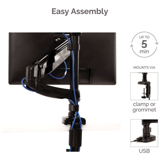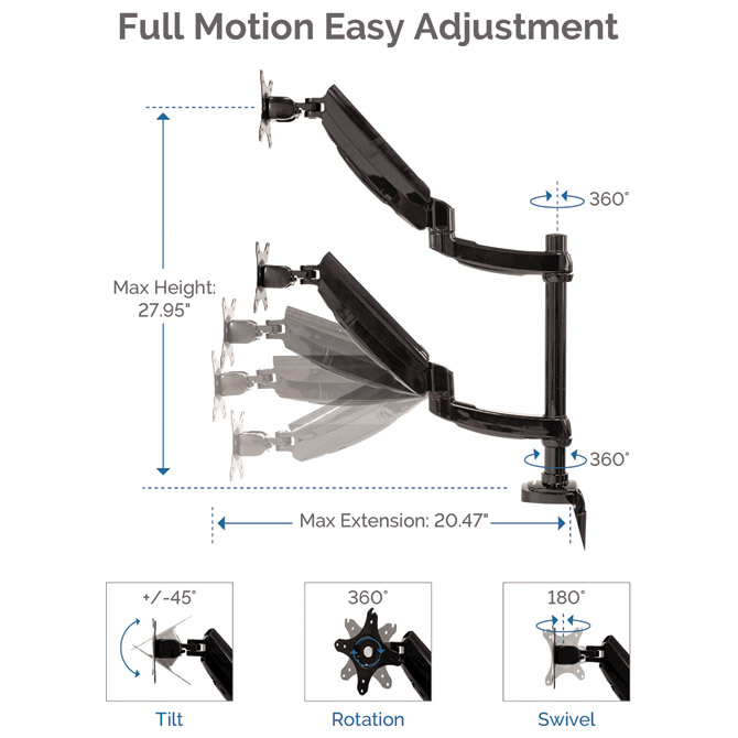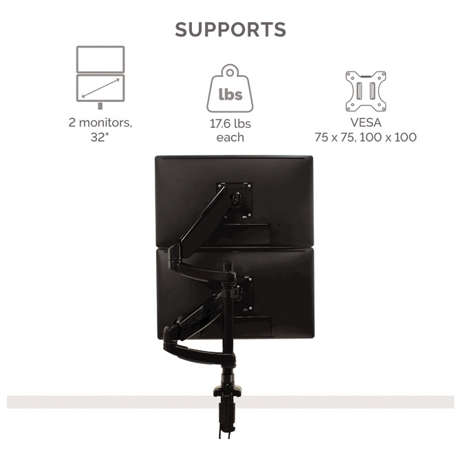 dve navpični kovinski roki z nastavljivo višino, držita monitorje do 8 kg vsako
