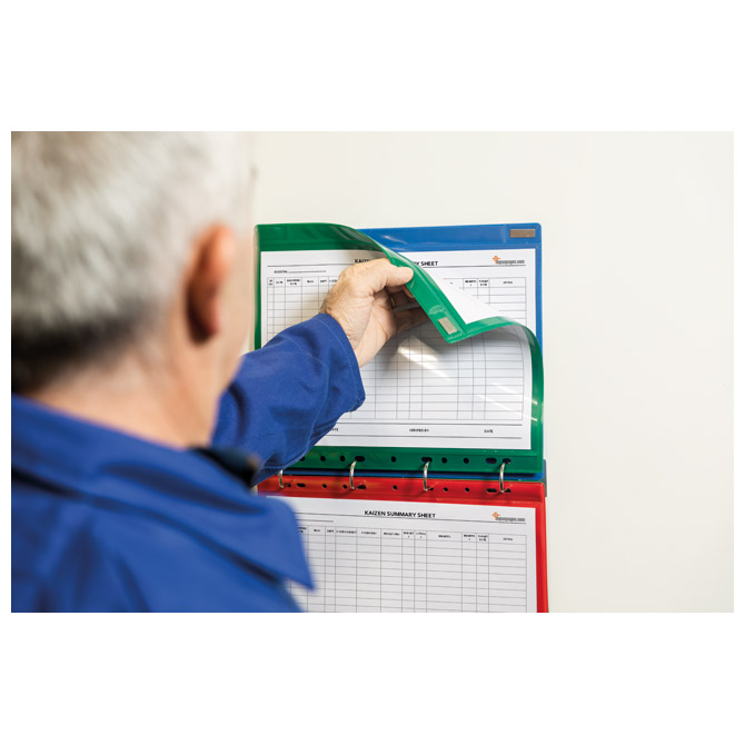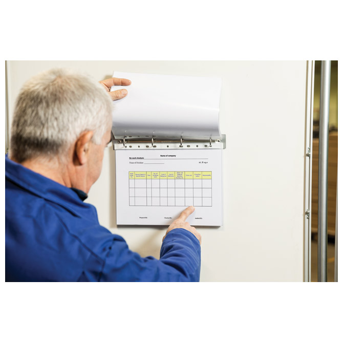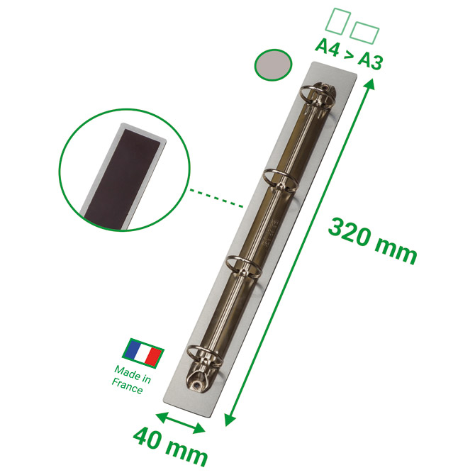 za mapo za vlaganje aluminij (80 % recikliran) 4 prstani fi: 30 mm dimenzije: 320x40 mm za dokumente: A5, A4 in A3 ima PVC magnet, ki ga lahko po želji premikate horizontalno do 1 kg papirja, vertikalno do 0,5 kg papirja