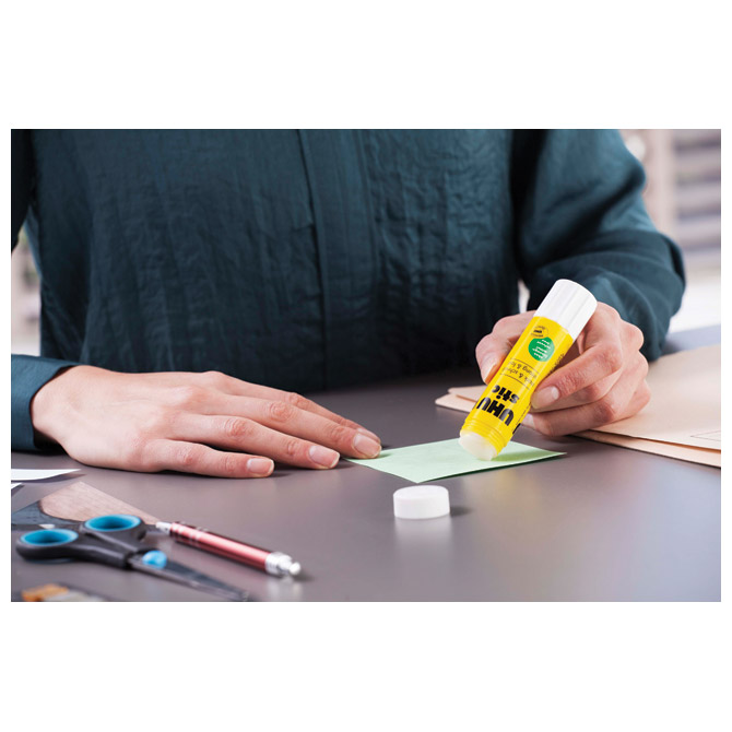 brez topil formula lepila je sestavljena iz 98% naravnih sestavin (vključno z vodo) za lepljenje: papirja, kartona, fotografij, ekspandiranega polistirena Styrofoam®, nalepk, tekstila itd. za močno, hitro in trajno lepljenje enostaven za uporabo ne mečka papirja in se zlahka odstrani z vodo navojna kapica podaljša življenjsko dobo lepila embalaža je izdelana iz 50 % reciklirane plastike barva lepila po sušenju je prozorna