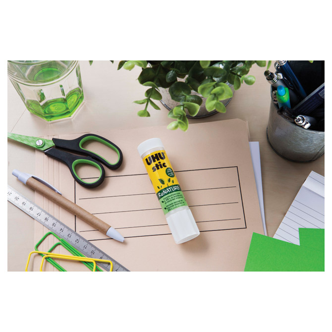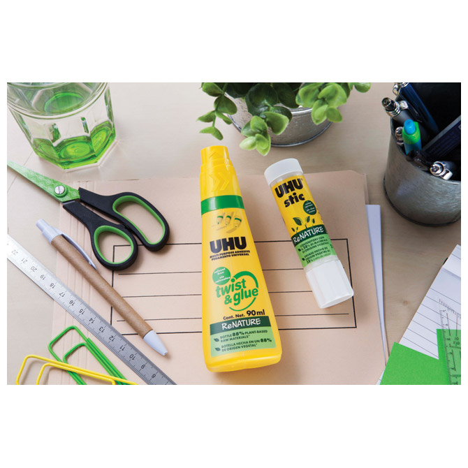 brez topil ReNature (zmanjša emisije CO2 in zmanjša porabo fosilnih surovin v primerjavi s standardnim lepilom v spoju UHU) formula lepila je sestavljena iz 98% naravnih sestavin (vključno z vodo) za lepljenje: papirja, kartona, fotografij, ekspandiranega polistirena Styrofoam®, nalepk, tekstila itd. za močno, hitro in trajno lepljenje enostaven za uporabo ne mečka papirja in se zlahka odstrani z vodo navojna kapica podaljša življenjsko dobo lepila embalaža je sestavljena iz 58% rastlinskega materiala barva lepila po sušenju je prozorna