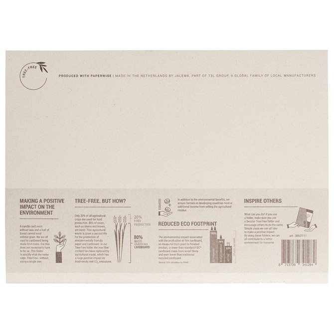 format: A4 dimenzije: 225x310 mm karton sprednja stran ima potiskane črte za lažje in preglednejše označevanje vsebine iz kmetijskih odpadkov, torej iz listov in stebel, ki bi jih sicer zažgali na prostem za izdelavo tega predmeta ni uporabljeno niti eno drevo!