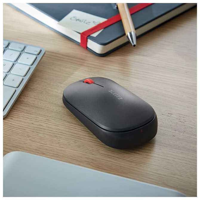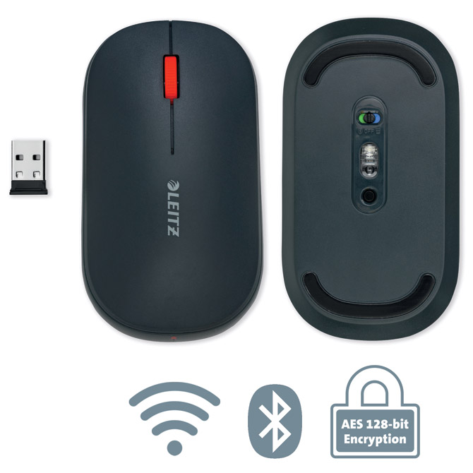 brezžično z nano sprejemnikom optično (izbirajte med nivoji 1200, 2400 ali 4000 dpi, da prilagodite hitrost kazalca miške na visoko za priložnostno brskanje ali na nizko za natančno urejanje) 2 gumba in kolesce (rdeče) tihe tipke enako primerna za levičarje in desničarje eleganten, moderen in minimalističen dizajn omogoča natančno sledenje tudi na najtežjih sodobnih pisarniških površinah kot so: steklo, granit, lak, marmor in les napajanje: baterija 1 x AA (priložena) dimenzije: 184x105x48 mm teža: 60 g primerno za osebne računalnike z ali brez bluetooth funkcije, novejše naprave z bluetooth LE in združljive z Windows, Chrome OS, macOS in Android OS povežite se s prenosnikom ali mobilno pametno napravo prek bluetooth 3.0 ali 5.0 (bluetooth LE) ali z namizjem prek 2,4 GHz USB-A Nano ključka šifrirna tehnologija na vladni ravni, ki ustreza varnostnim protokolom podjetja in ščiti vaše podatke pred morebitnimi hekerji v kartonski škatli