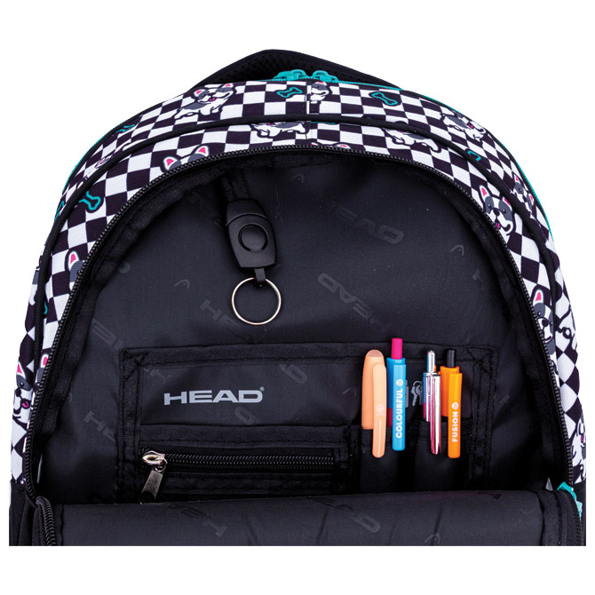 Dimenzije: 30x42x19 cm mehki naramniki z nastavitvijo dolžine Ergonomsko oblikovan hrbtni del omogoča pretok zraka močno odraža varnostni deli ojačan ročaj 3 predelki z zapiranjem na zadrgo organizator z obeskom za ključe v sprednjem predalu predal za prenosni računalnik predelki ob straneh vodoodporen material