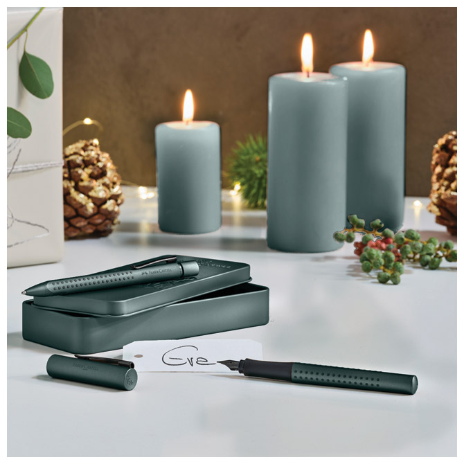 edinstven dizajn Grip mehak oprijem za bolj udobno pisanje optimalna kombinacija črnila in konice nalivnega peresa omogoča izjemno gladko, tekoče in lahkotno pisanje kovinska sponka (črna) in konica iz nerjavečega jekla (črna) primerna tudi za levičarje lahko se uporablja klasična kartuša ali črpalka Faber Castell v kartonski darilni škatli