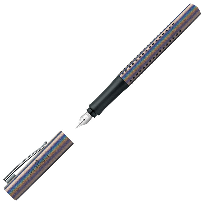 edinstven dizajn Grip debelina konice: F (fina) z glamuroznim bleščečim učinkom mehak oprijem za bolj udobno pisanje optimalna kombinacija črnila in konice nalivnega peresa omogoča izjemno gladko, tekoče in lahkotno pisanje sponka iz nerjavečega jekla (srebrna) in konica iz nerjavečega jekla (srebrna) uravnoteženo težo pokrova in ko je pritrjen na zadnji del primerna tudi za levičarje lahko se uporablja klasična kartuša Faber Castell v kartonski darilni škatli
