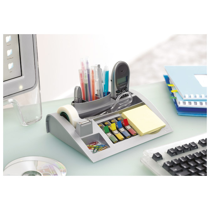 vsebuje: samolepilni blok Post-it® 654 rumen (dimenzije 76x76 mm 72 g/m2 100 listov listi se ne zvijajo večpremične), samolepilne zastavice Post-it® 683-4 (dimenzije: 11,9x43,1 mm 4 barve x 35 zastav za označevanje strani in dokumentov barve: rdeča, modra, zelena in rumena pretisni omot) in lepilni trak Scotch® Magic™ 810 (dimenzija: 19 mm x 33 m večnamenski neviden pri fotokopiranju ne pušča vidnih sledi sčasoma ne porumeni nanj se lahko piše loči tiho in brez trganja trga s prsti celulozni acetat prosojno bela) predelki za: svinčnike, kalkulator, sponke in žeblje v kartonski škatli