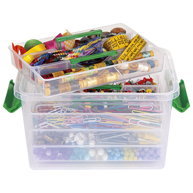 PP škatla s sponkami in ročajem+predali CMP.819VS prozorna/zelena