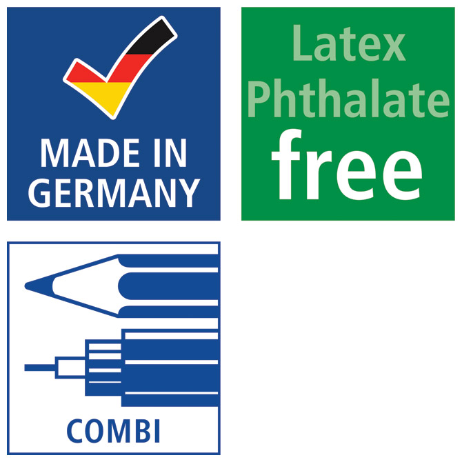 vsaka gumica ima črtno kodo in je zavita v folijo za grafitni svinčnik, modri del pa za brisanje kemičnega svinčnika s pokrovom brez lateksa dimenzije: 65x23x13 mm visoka kvaliteta izjemno rahlo brisanje brez drobljenja