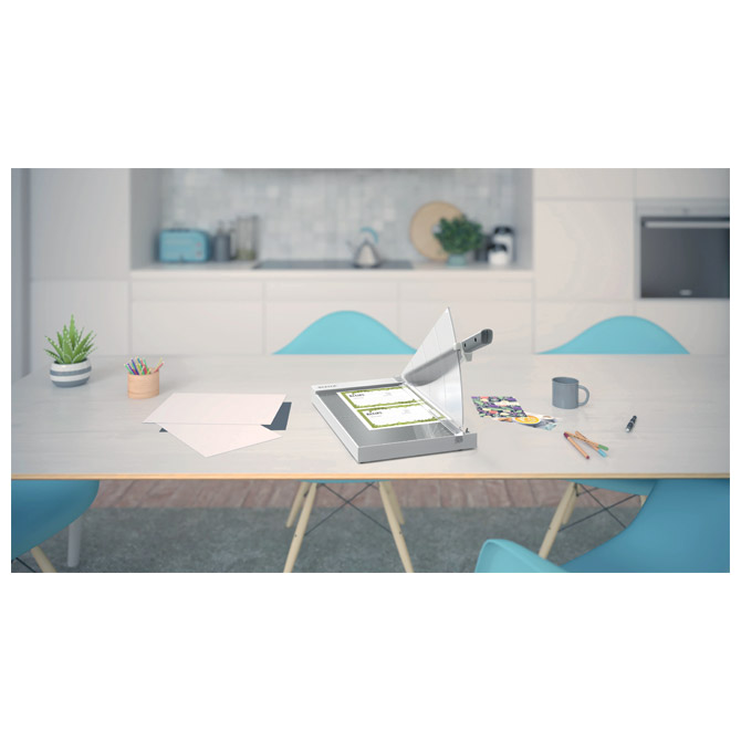 namizje razreže 15 listov 80 gramov papirja poleg papirja reže tudi druge materiale kot so: nalepke, filmi, fotografije, folije (ne kovinske) in karte dolžina reza: 381 mm (format: A4+) močan in robusten rezalnik papirja, idealen za pisarniško uporabo edinstvena lučka EdgeGlow osvetli nož za večjo vidljivost in maksimalno natančnost (za osvetlitev potrebujete 3 x AAA baterije - priložene) trdno plastično podnožje z nedrsečimi gumijastimi nogami za varnost in stabilnost površina podstavka je steklena in gladka s preprostimi metričnimi mrežnimi črtami, kotnimi vodili in natančnimi merilnimi pravili za enostavno poravnavo papirja visokokakovosten nož iz nerjavečega jekla nož ima ergonomsko oblikovan ročaj, ki zagotavlja enostavne in natančne rezultate prozorna ročna sponka za papir varno drži papir na mestu varen ščitnik rezila zagotavlja popolno zaščito, medtem ko varnostni zapah drži rezilo zaklenjeno, ko ni v uporabi dimenzije: 29,9x34,4x57,1 cm teža: 2,76 kg 5-letna garancija (ne velja za potrošne dele)