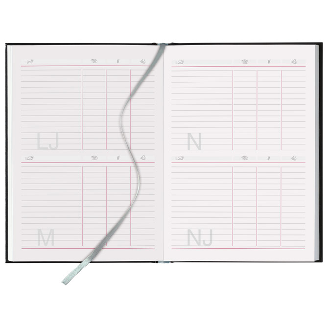 se lahko uporablja več let knjižni blok: 224 strani (z imenikom) 70 g/m2 bel papir platnica je izdelana iz materiala, primernega za: sitotisk, suhi žig, zlati/srebrni folio tisk in barvni folio tisk