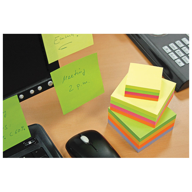 dimenzije: 50x50 mm 240 listov možnost večkratne selitve lepilo je na vodni osnovi brez topil 4 neonske barve: oranžna, roza, zelena in rumena