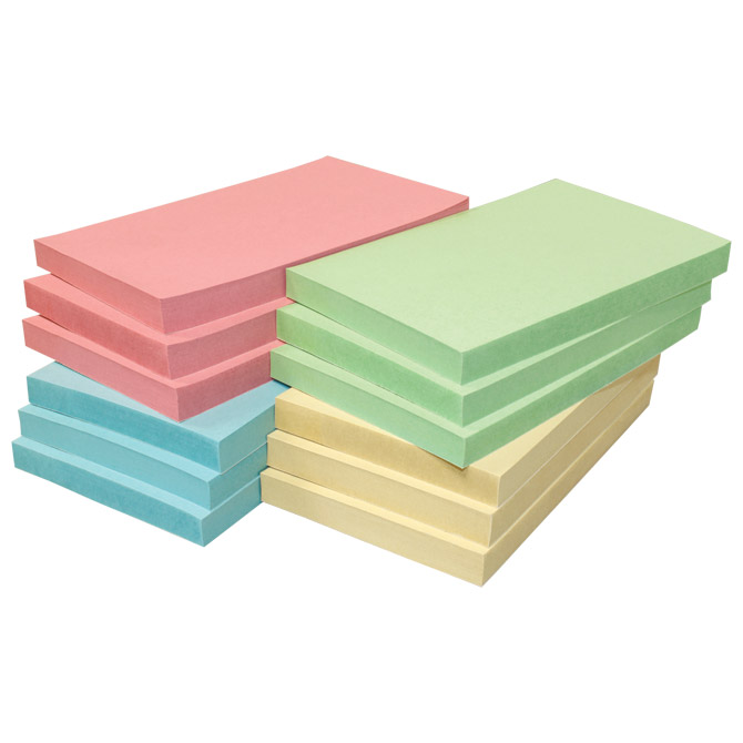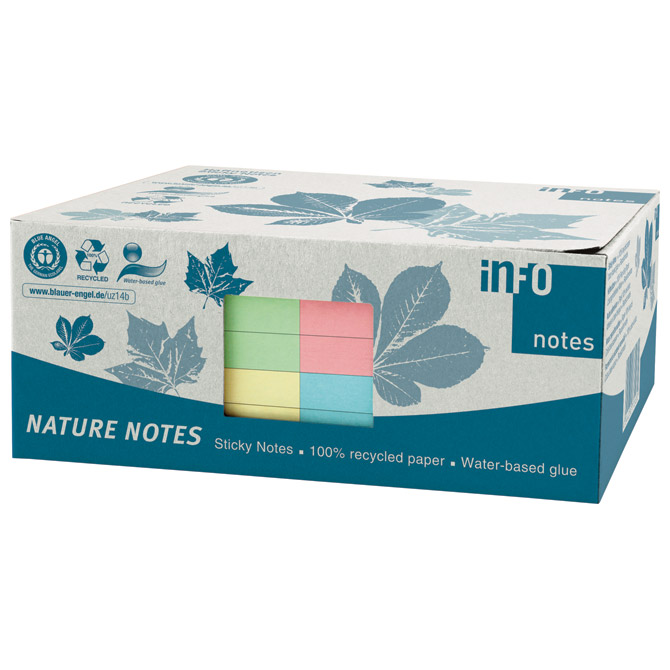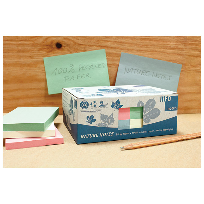 dimenzije: 125x75 mm 12x100 listov možnost večkratne selitve iz 100% recikliranega papirja okolju prijazen (certifikat Modri angel) lepilo je na vodni osnovi brez topil 4 pastelne barve: roza, modra, zelena in rumena v 100% reciklirani kartonski škatli