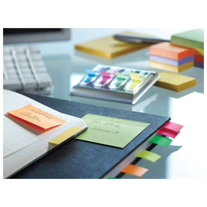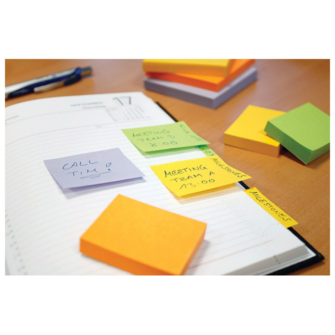 dimenzije: 40x50 mm 12x100 listov možnost večkratne selitve lepilo je na vodni osnovi brez topil 4 neonske barve: vijolična, oranžna, zelena in rumena