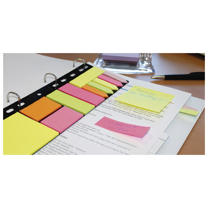 dimenzije: 100x270x4 mm vložek za A4 (univerzalna perforacija) vsebuje: 3 barve x 25 zastavic (25x75 mm), 5 barv x 25 zastavic (12x45 mm, oblika puščice), samolepilni blok 2 barvi x 25 listov (35x50 mm) in samolepilni blok rumen x 25 listov (75x75 mm) ) papir za označevanje strani in dokumentov možnost večkratne selitve lepilo je na vodni osnovi brez topil pretisni omot