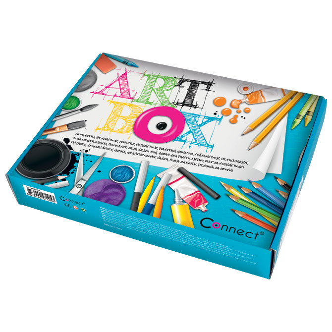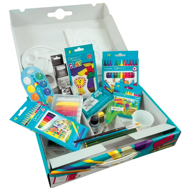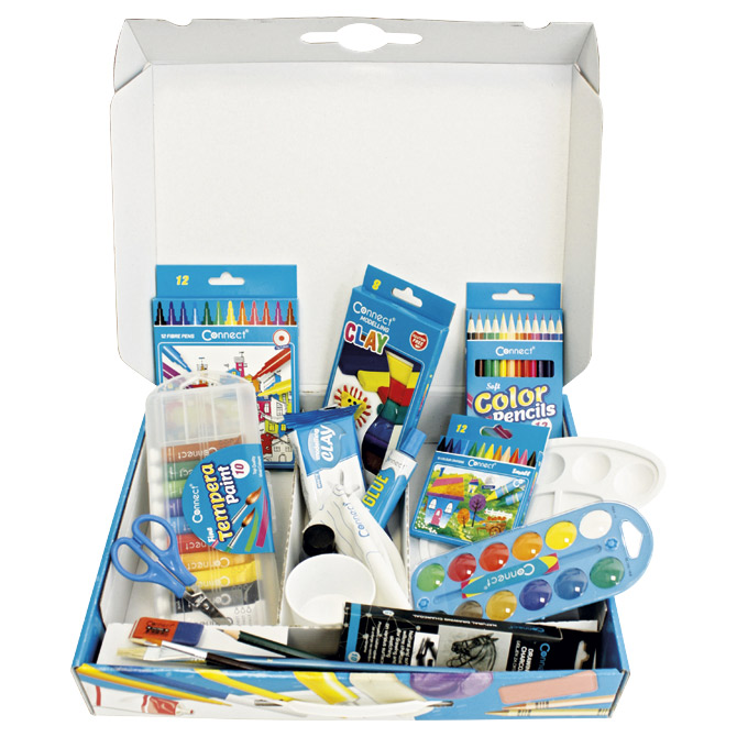 set vsebuje: grafitne svinčnike, lesene barve, flomastre, voščene barve, vodene barve, tempere, paleto, čopiče, glino, plastelin, oglje, tuš, škarje, lepilo, radirko, skodelico, folijo za klop, belo tempero barva 25 ml, črn flomaster, likovni predpasnik in šilček v kartonski škatli