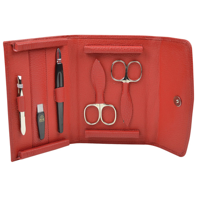 vsebuje: 2 škarjici, rašpico, pinceto in čistilo za nohte zapiranje gumbov v usnjeni torbici
