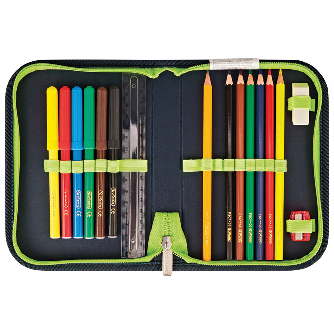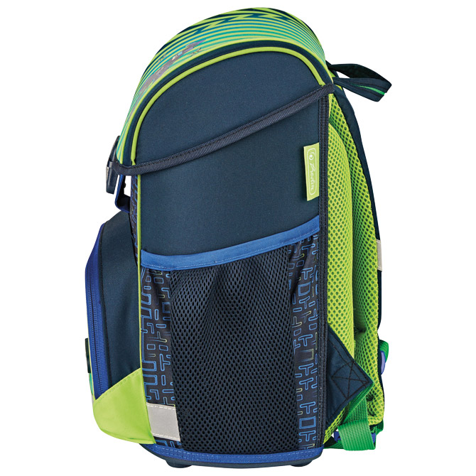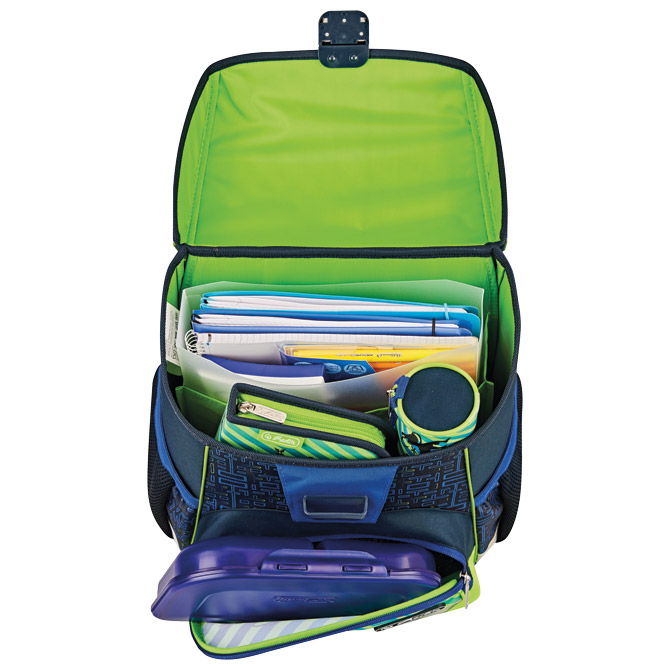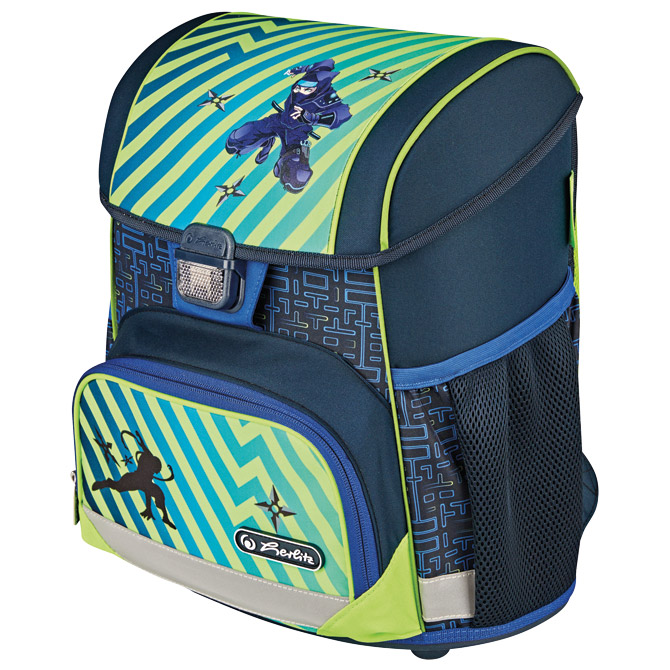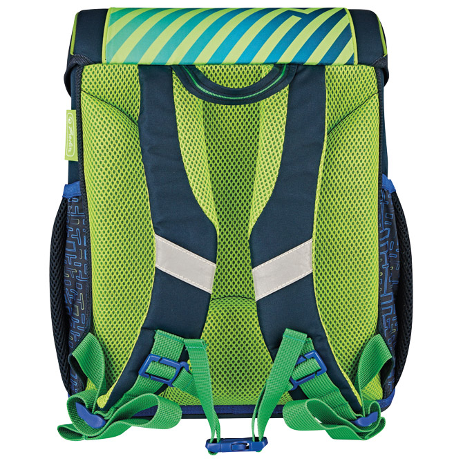 vsebuje: šolsko torbo (dimenzije: 37x31x22 cm) prostornina: 15 l teža: 900 g anatomski Ergonomsko oblikovan hrbtni del omogoča pretok zraka nastavljivi trakovi zapenjalno sponko na klik 3M odsevni trakovi vodoodporen material velik notranji predal s posebnim predalom za knjige 1 sprednji žep 2 stranska žepa) vreča za truplo, peresnica s 16 kosi opreme in okrogla peresnica