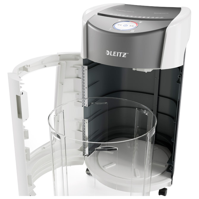 Ima edinstveno tehnologijo vrtenja zabojnikov (BRT), ki učinkovito poveča zmogljivost za +33 %. Vrtljiva košara zagotavlja enakomerno porazdelitev papirja in preprečuje nastanek piramidaste oblike v košari. To omogoča, da se v koš namesti dodatnih 140 listov A4, preden ga je treba izprazniti. Indikator polne košare se aktivira šele, ko je dosežena 100-odstotna zmogljivost. 10 listov v 10 sekundah Prostornina koša: 35 litrov (550 listov A4) Uničenje z mikro rezom (mini konfeti) širina reza: 2x15 mm širina vhoda: 223 mm na kolesih Stopnja varnosti: 5 ima funkcijo samodejnega zaustavljanja in vzvratnega vrtenja, ko je vloženega preveč papirja (tehnologija proti zastoju) neprekinjeni delovni cikel: 120 minut tiho delo rušilca Poleg papirja uničuje tudi sponke (ročne in mehanske) Dimenzije: 406 x 589 x 320 mm teža: 15 kg 2 leti + 1 - dodatno garancijo dobite, če se registrirate na leitz.com Vrtljivi LED zaslon z indikatorji: polna košara, odprta vrata, pregrevanje in prenatrpanost.