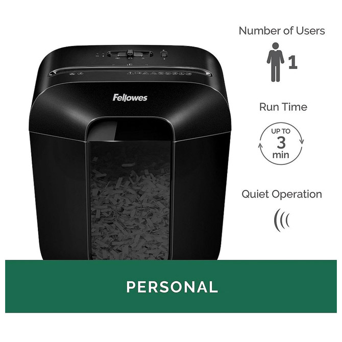 ročno izdelana kapaciteta: 6 listov po 70 g Prostornina koša: 11,5 litra (približno 60 listov) Uničenje s križnim rezom širina reza: 4x40 mm širina vhoda: 220 mm Neprekinjeni delovni cikel: 3 minute vklopljeno / 30 minut izklopljeno raven hrupa: 70 dB Stopnja varnosti: 4 S premikanjem gumba preprečite nenamerno aktivacijo drobilnika, ko je varnostna zapora SafetyLock vklopljena. vrsta košare: dvigalo za glavo ima okno Poleg papirja uničuje tudi sponke za papir (ročne in avtomatske) in kreditne kartice. dimenzije: 361x310x220 mm teža izdelka: 3,6 kg 2-letna garancija na stroj, 3-letna garancija na rezila za enostavno uporabo doma in v majhni pisarni