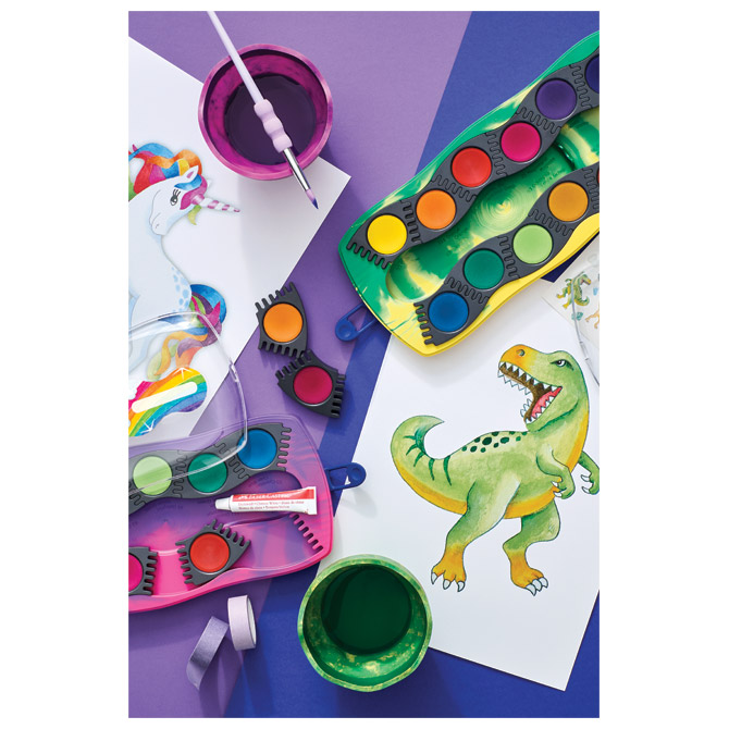 12 barv premer 24 mm bela tempera in list nalepk Na prozornem pokrovu je paleta s 5 belimi posodicami. Pokrov je mogoče odstraniti in enostavno očistiti (pritrjen je z dvema sponkama). Na pokrovu je prostor za pisanje imena. svetle barve z visoko motnostjo in prekrivnostjo za različne vrste slikarskih tehnik Vsaka barva je v svoji hišici, ki jo je mogoče poljubno razporediti v različne oblike idealno za barvanje, zlaganje in igranje razvito v skladu z najnovejšimi učnimi standardi PVC škatla