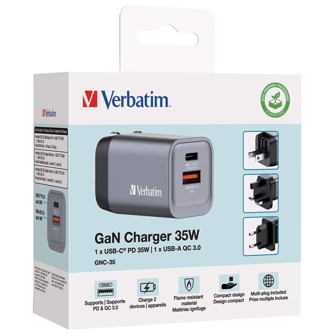 Potovalni polnilnik za mobilne telefone in tablice GaN 1xUSB-C/PD 35W/1xUSB-A QC 3.0 (EU/UK/US) Verbatim 32200