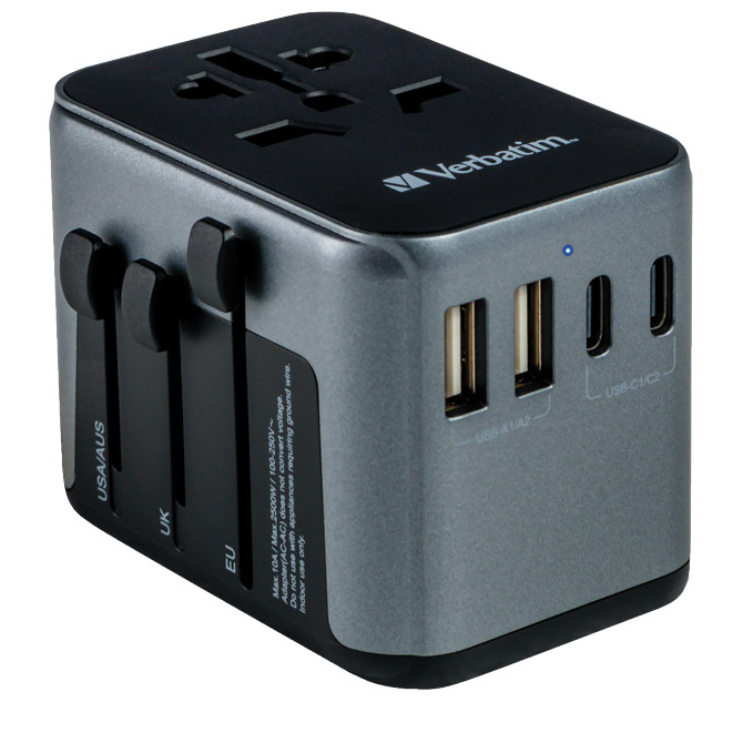 Verbatimov univerzalni potovalni adapter lahko uporabljate v več kot 180 državah – vzemite ga s seboj kamor koli in vam nikoli ne bo zmanjkalo energije. Ta večnamenska vtičnica, ki deluje po vsem svetu, vam bo omogočila priklop na katero koli lokalno električno vtičnico po svetu in polnjenje naprav, ki potrebujejo veliko energije, kot so prenosniki in baterije fotoaparatov. Vrata USB-C in USB-A na spodnji strani lahko polnita vse vaše naprave USB, vključno s pametnimi telefoni, zvočniki Bluetooth, tablicami, prenosnimi baterijami in Kindle napravami. Oblike vtičnic: EU, Združeno kraljestvo, ZDA/Japonska, Avstralija 1 izhod USB-C z izhodno močjo 30 W in hitrim polnjenjem Quick Charge 3.0: 18 W 2 izhoda USB-C: največ 15 W 2 izhoda USB-A: največ 12 W Hkrati polnite 6 naprav. Ognjevarni polikarbonatni material Certificirana varovalka + rezervna varovalka Varnostna ključavnica za otroke (odpre se lahko le s silo, večjo od 75 N / 7,5 kg / na luknjo) LED indikator stanja Vhod AC: 100 V–250 V, 50/60 Hz Nazivna moč: 100–250 V AC 10 A največ, 2500 W največ Izhod USB-A1/A2: 5,0 V 2,4 A 12,0 W največ Izhod USB-C1/C2: 5,0 V 3,0 A 15,0 W največ Izhod vrat USB-C PD: 5,0 V 3,0 A 15,0 W, 9,0 V 3,0 A 27,0 W 12,0 V 2,5 A 30,0 W 15,0 V 2,0 A 30,0 W 20,0 V 1,5 A 30,0 W Varovalka: Skladna z BS1362 Material: Ognjevarni polikarbonat Dimenzije: 70 mm x 50 mm x 54 mm Teža: 149 g Delovna temperatura: 0–35 °C